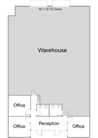 Unit 3911-S/T features an open reception area, three (3) private offices, one (1) office restroom, a coffee bar, and a warehouse. The warehouse has one (1) restroom, two (2) ground level (GL) doors, with a 15′ foot clearance.