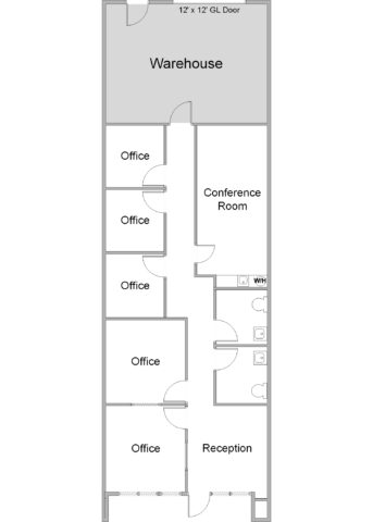 Reception, 5 private offices, 2 restrooms, coffee bar, & warehouse with 15′ clearance.