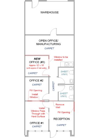 Unit 9300-109 features an entry reception area, two (2) Private offices and two (2) Private restrooms, as well as a wash area in the manufacturing side of the warehouse.