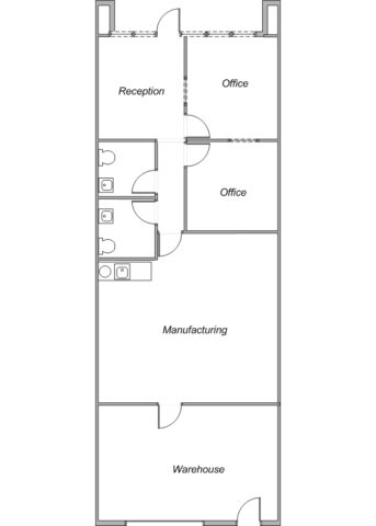 Reception, 2 private offices, 2 restrooms, large open bullpen, and warehouse.