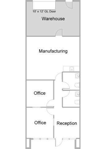 Reception, 2 private offices, large open manufacturing room with 12′ high ceiling & HVAC, 2 restrooms, coffee bar, & warehouse with 15′ clearance.