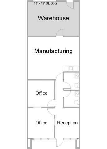 Reception, 2 private offices, large open improved Flex room with 12′ high ceiling & HVAC, 2 restrooms, coffee bar, & warehouse with 15′ clearance.